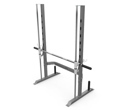 Рама выдерживает нагрузку до 300 кг. Гриф шириной 203 см с замком lock-jaw с рифлёным покрытием регулируется в 7-ми положениях по высоте. Гриф двигается по чёткой траектории, благодаря чему вместо контроля над положением тела, вы сможете сосредоточиться на технике выполнения.