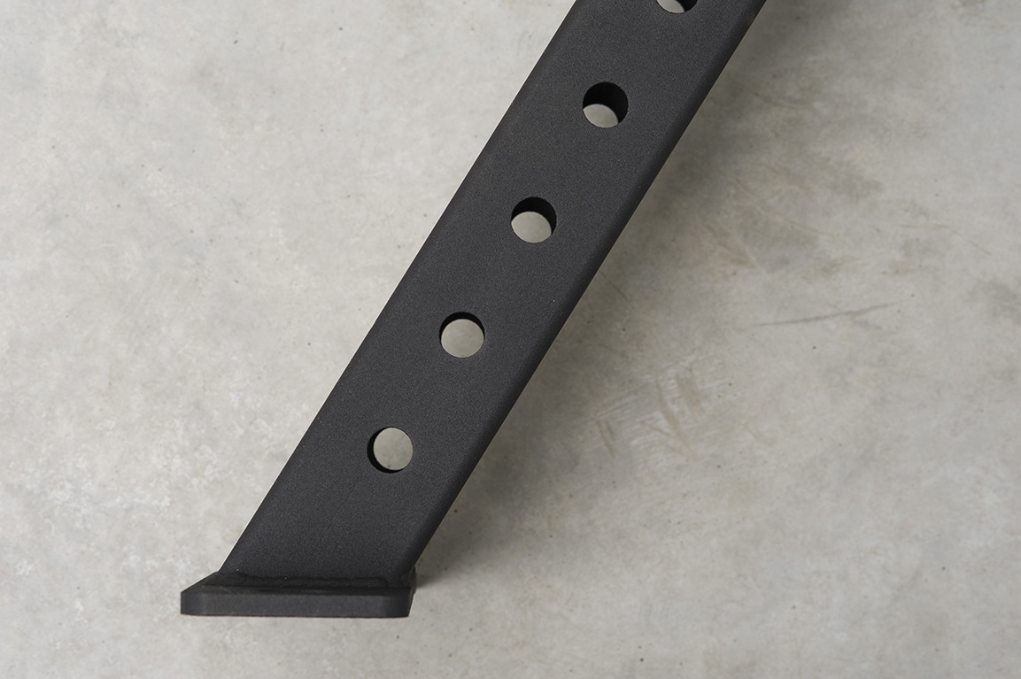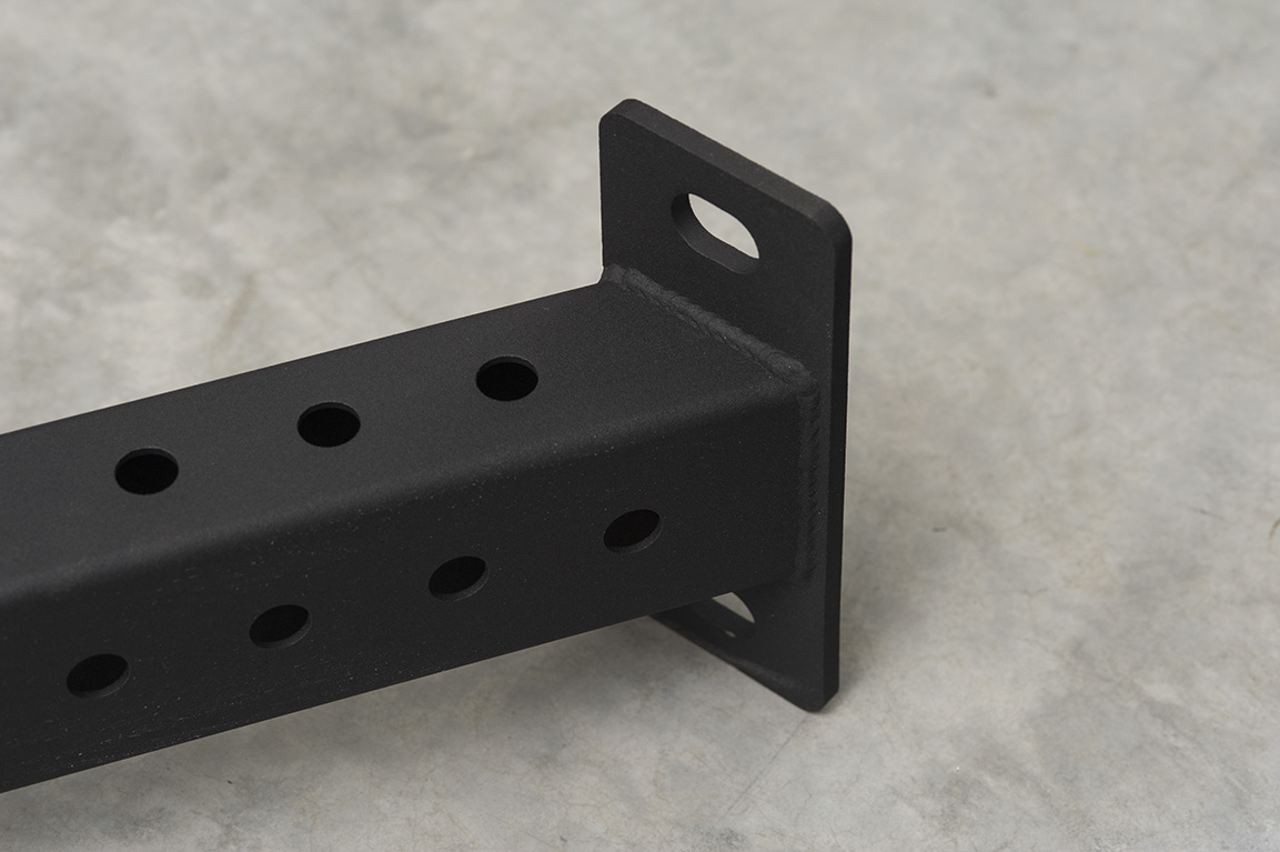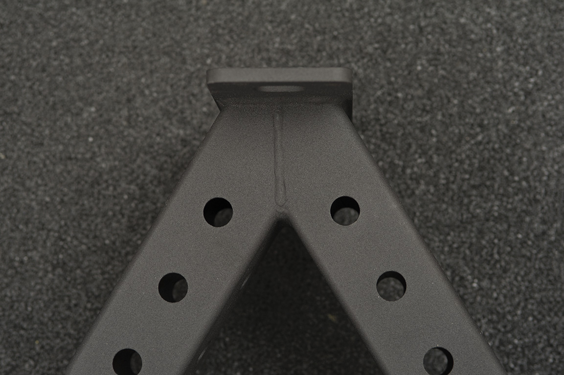 Треугольная балка изготовлена из стальной профильной трубы сечением 80х60 мм. По всей длине имеет перфорацию диаметром 17 мм с шагом отверстий в 50 мм. Монтажные пластины имеют диаметр отверстий 17 мм. Поверхность балки для кроссфита окрашена черной порошковой краской и запекается в печи при высокой температуре. Купить треугольную балку Вы можете в нашем магазине
