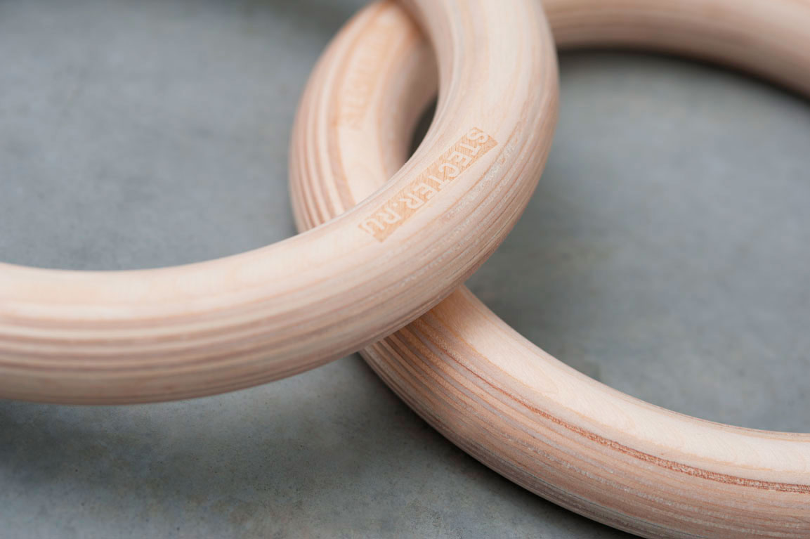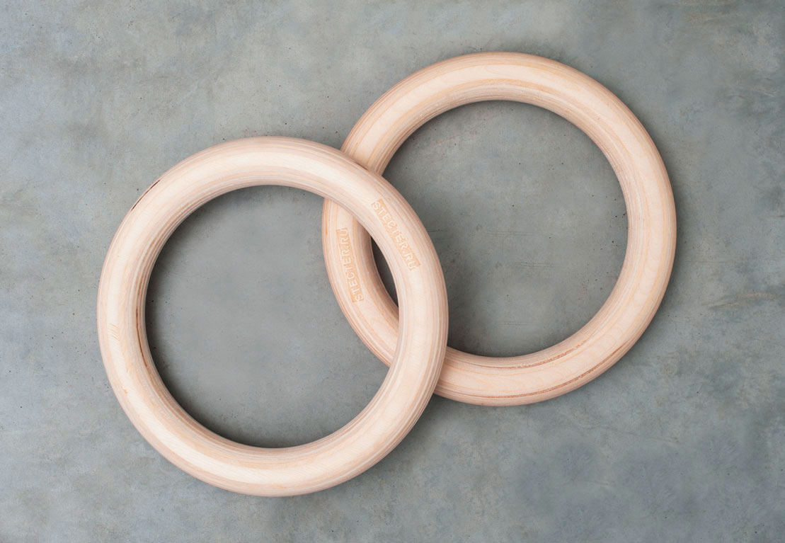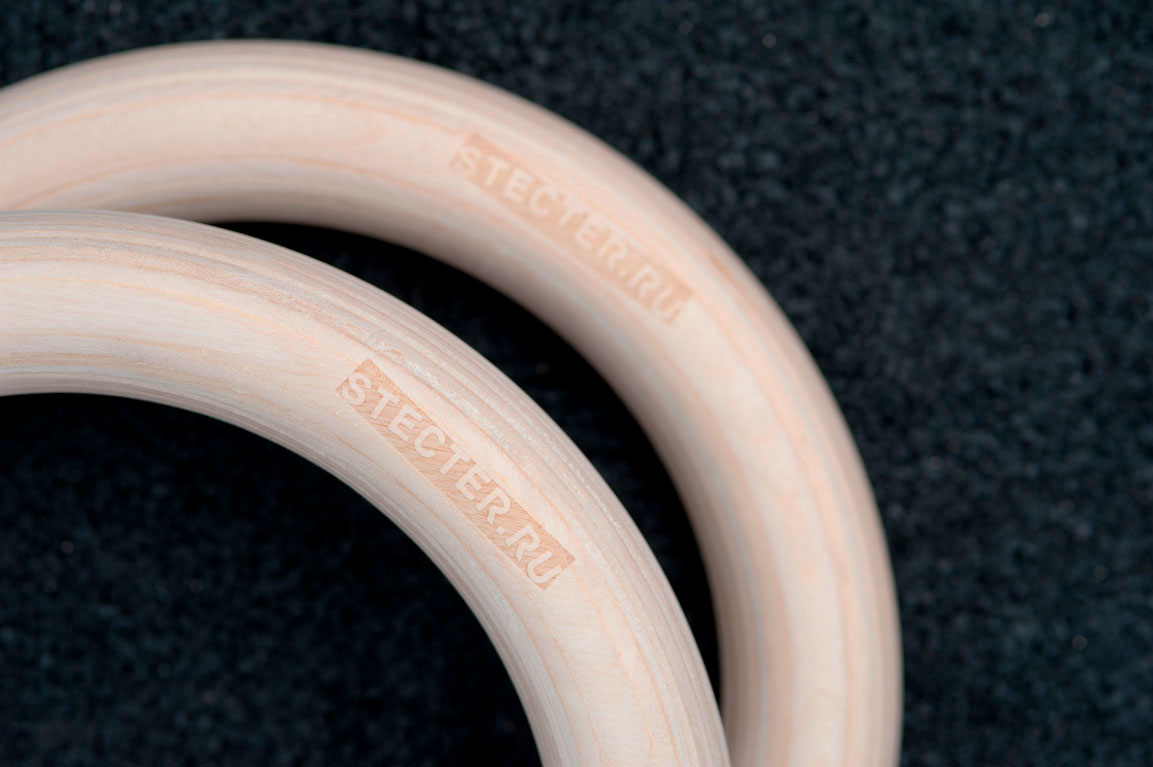 Деревянные кольца изготавливаются из влагостойкой фанеры. Их поверхность гладко шлифуется, чтобы не повредить руки спортсменов. По сравнению с металлическими кольцами, деревянные гораздо легче и на их поверхности отсутствует краска. В металлических кольцах краска будет откалываться при ударе друг об друга и на месте скола может образоваться ржавчина. Помимо этого само место скола может иметь острые края, которые добавляют дискомфорт во время тренировок.