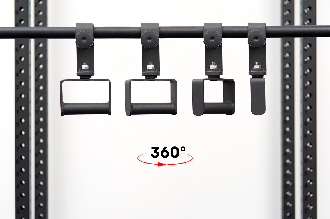 Вращающиеся рукоятки устанавливаются на перекладину диаметром не более 34 мм и дополнительно фиксируются барашком. Свободное вращение каждой ручки на 360 градусов и возможность выбирать любую ширину и тип хвата для подтягиваний раскрывают ряд особенностей (преимуществ) поворотных ручек: