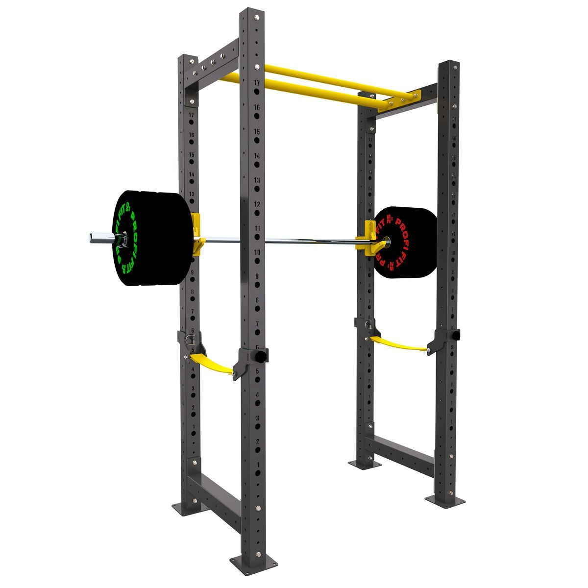 - Силовая рама оснащена регулируемыми по высоте страховочными упорами и фиксаторами для штанги, которые можно подстраивать под рост спортсмена или под конкретные тренировки, так же это позволяет установить скамью для выполнения упражнения жим из положений сидя или лежа. Вверху силовой рамы расположен турник с двумя перекладинами разного диаметра. Страховочные упоры сделают упражнения со штангой более безопасными и менее травмоопасными для спортсменов.