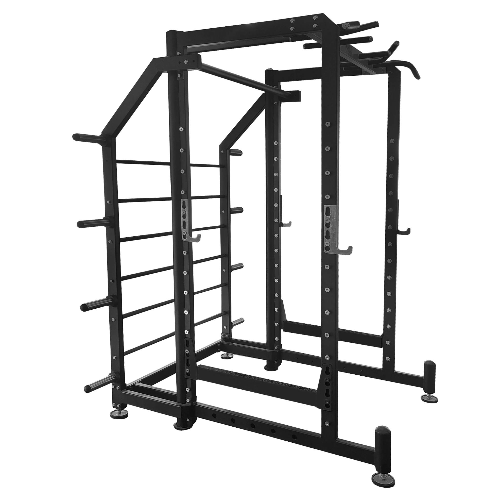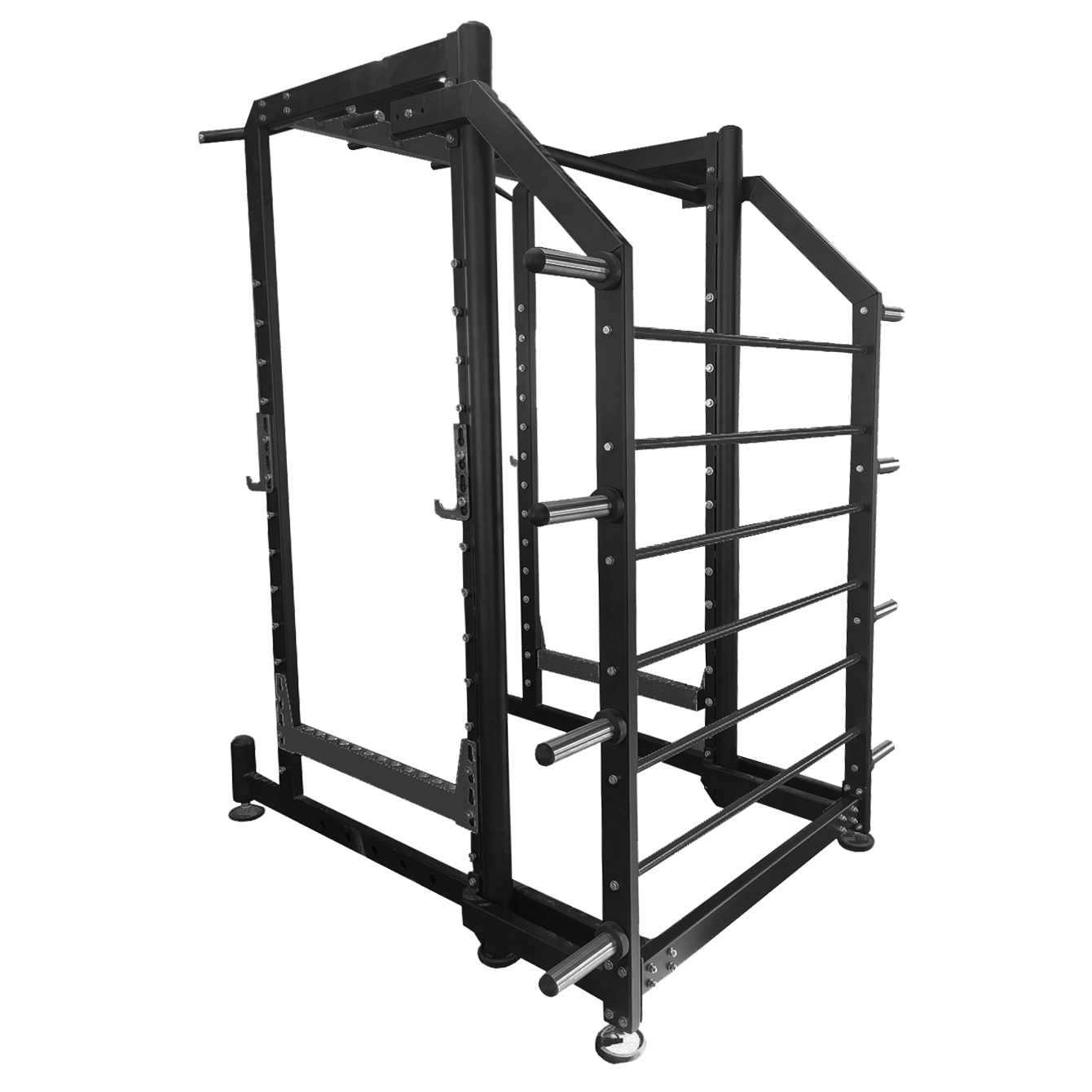 Силовая рама для приседаний AL-315 от BRONZE GYM имеет надежную и прочную конструкцию, которая включает в себя страховочные ограничители и съемные крюки для грифа.
