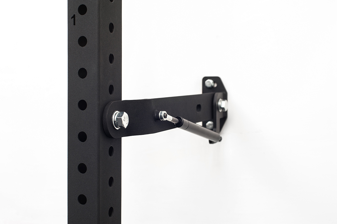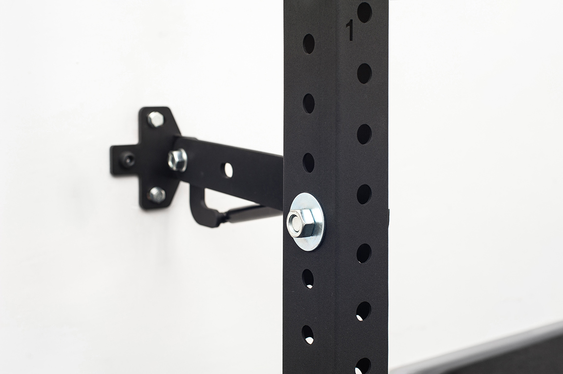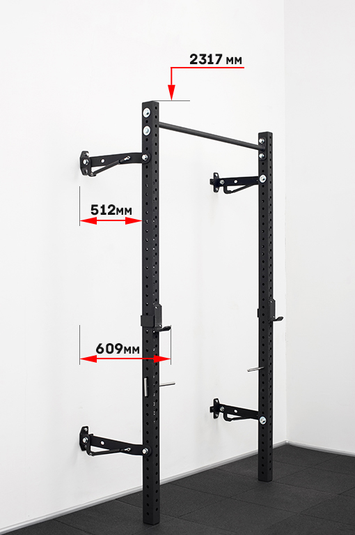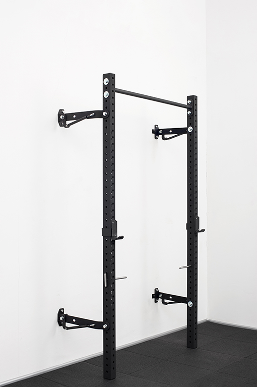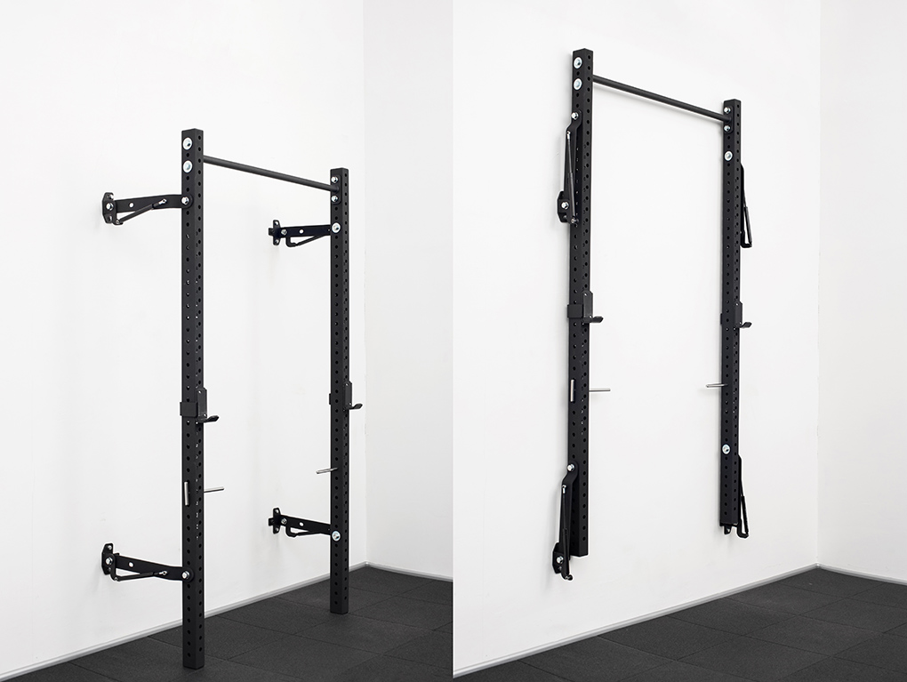 Пристенная складная силовая стойка позволяет проводить функциональные тренировки в небольших домашних и гаражных спортзалах. После тренировки она складывается и прилегает к стене, тем самым освобождая пространство в помещении. Специальные подъёмные механизмы помогают пользователю при складывании функциональной рамы к стене, таким образом с этим легко справится даже девушка. В сложенном состоянии опорные стойки могут быть зафиксированы с помощью колышков для резиновых петель (поставляются в комплекте), чтобы рама не могла разложиться - это сделано для обеспечения безопасности.