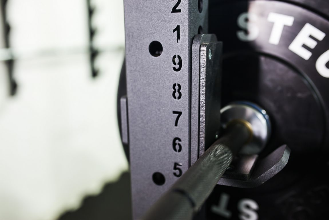- Перфорированные опорные стойки с нумерацией. Опорные стойки имеют специальную перфорацию с переменным шагом 50 и 30 мм между центрами отверстий. Более частый шаг используется в зоне установки страховочных упоров, т.к. именно там определяется уровень безопасности для атлета. Это актуально как для выполнения приседаний со штангой, так и для жима штанги лежа (при использовании скамьи для жима).