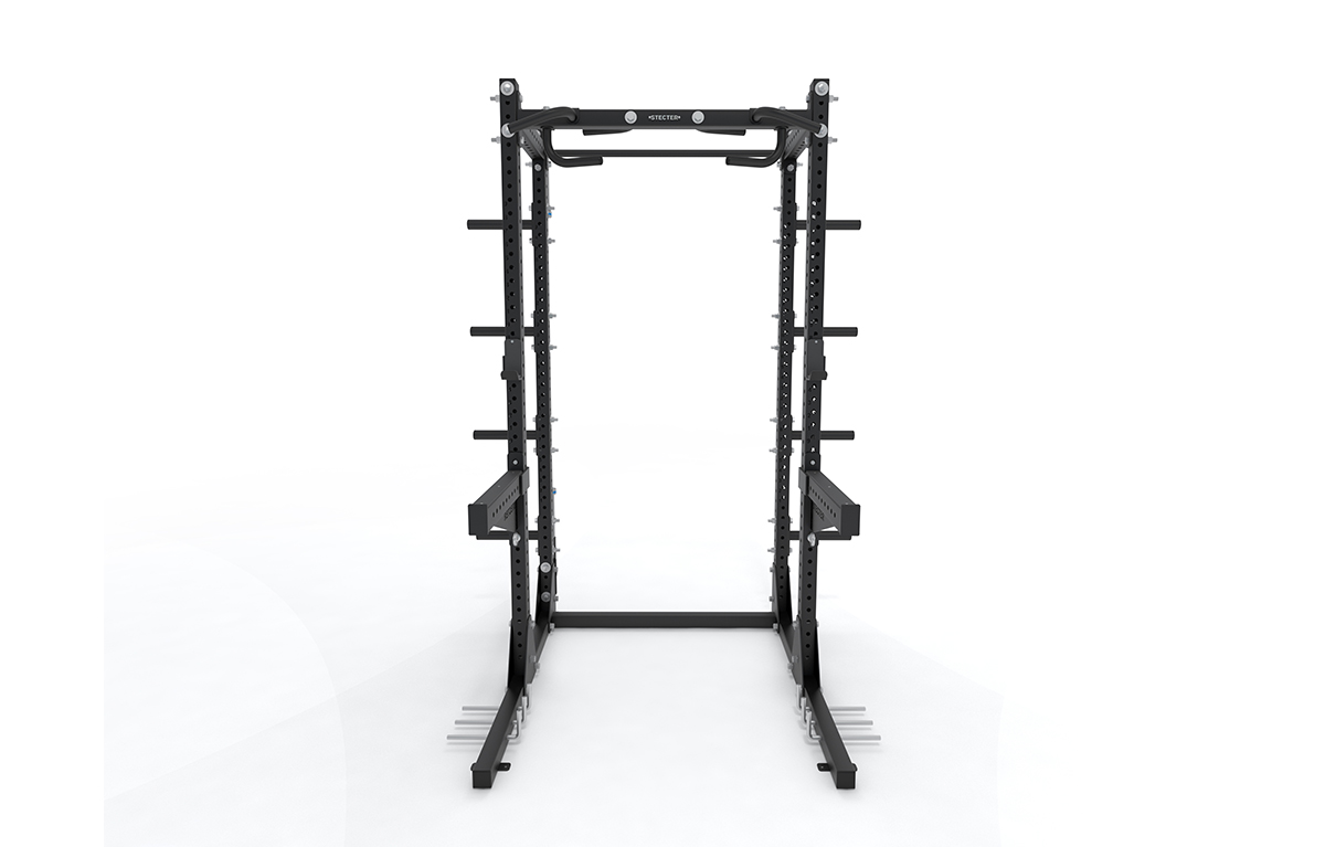 - Опорные стойки данной кроссфит рамы выполнены из толстостенной стальной трубы и имеют перфорацию с шагом 5 см для более точной настройки положения штанги и страховочных упоров.