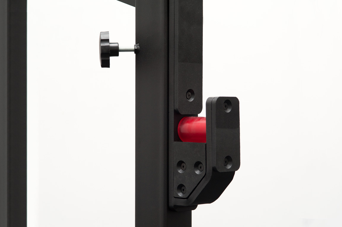 - С помощью рычажного механизма можно изменять высоту штанги, лежащей на стойке не снимая ее.