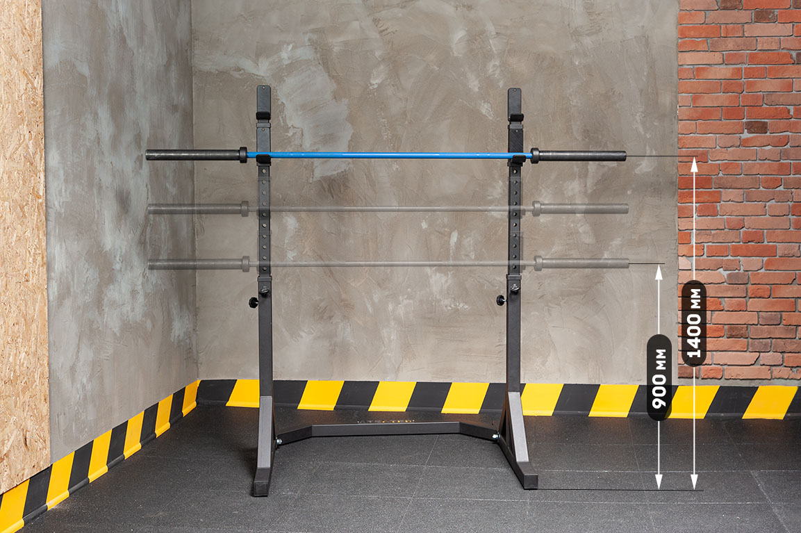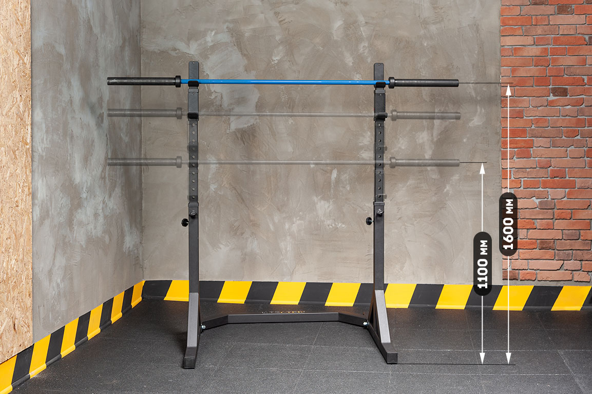 - Крюки для жима лёжа регулируются от 900 до 1400 мм от пола. Крюки для работы с штангой в стойке регулируются по высоте 1100 - 1600 мм.