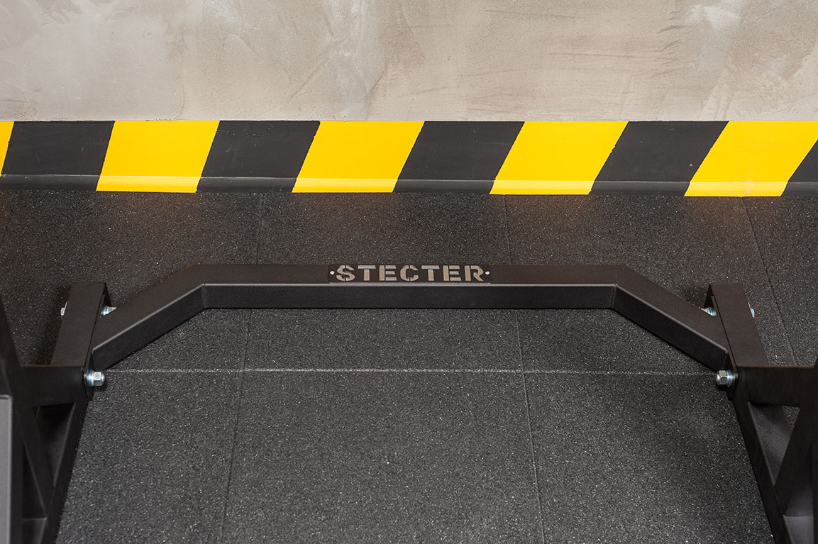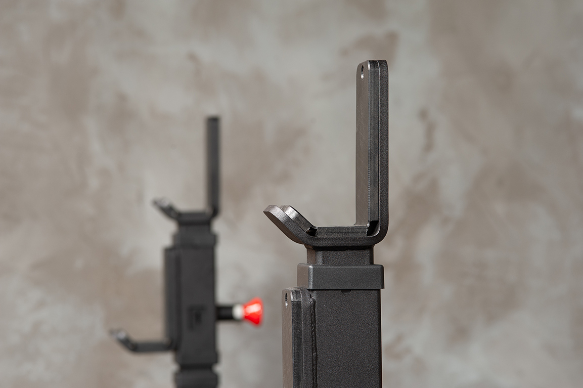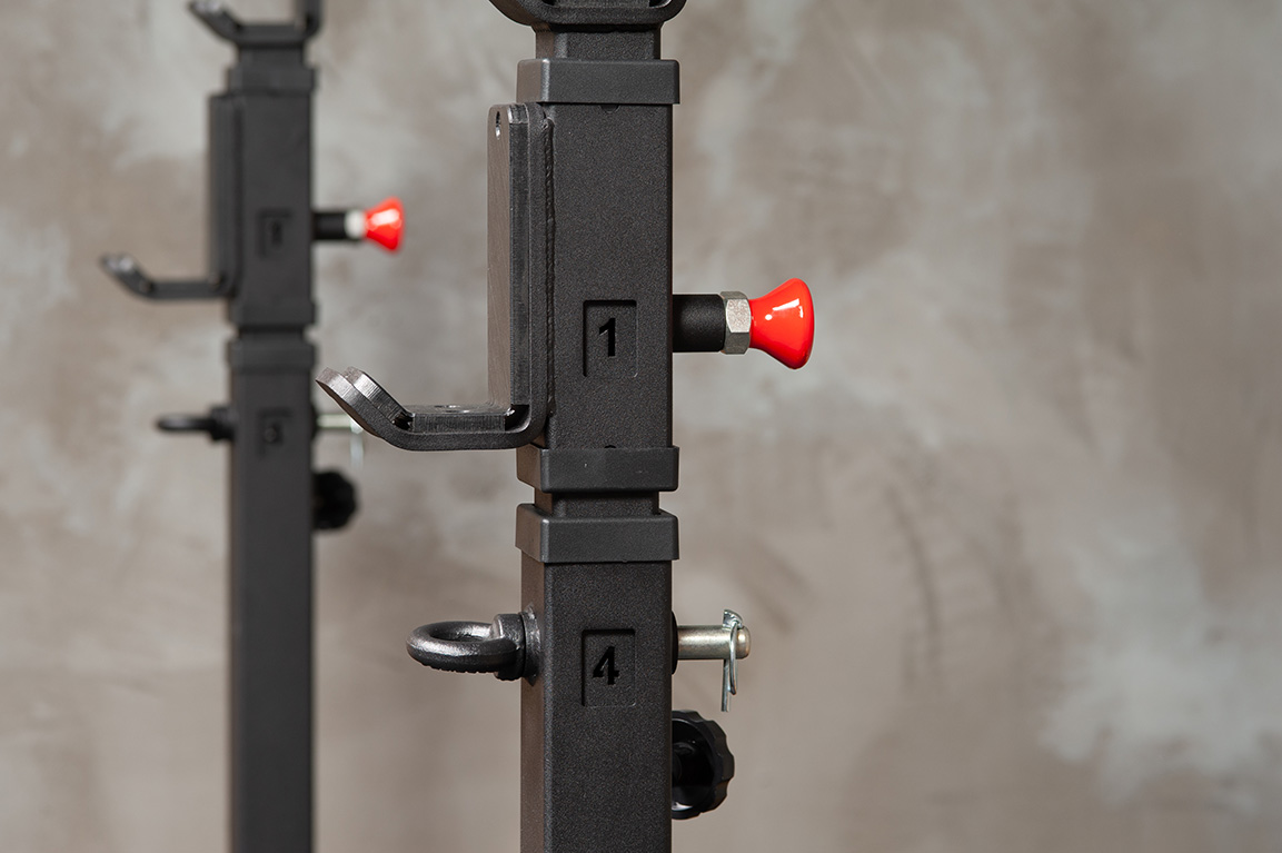 Каждый J-крюк имеет накладки из СВМПЭ для бережного контакта с рифлением на рукоятке грифа. Специальные центрирующие заглушки в конструкции стоек исключают повреждение краски на подвижных частях во время регулировок высоты J-крюков и сохраняют красивый внешний вид оборудования. Переключения высоты J-крюков для жима подразумевает частое использование, поэтому для удобства используется пружинный фиксатор. При регулировке положение крюков для работы в стойке используется мощный штыревой фиксатор диаметром 16 мм с защитой от случайного "вылета", а так же дополнительный резьбовой фиксатор для устранения люфтов подвижных механизмов.