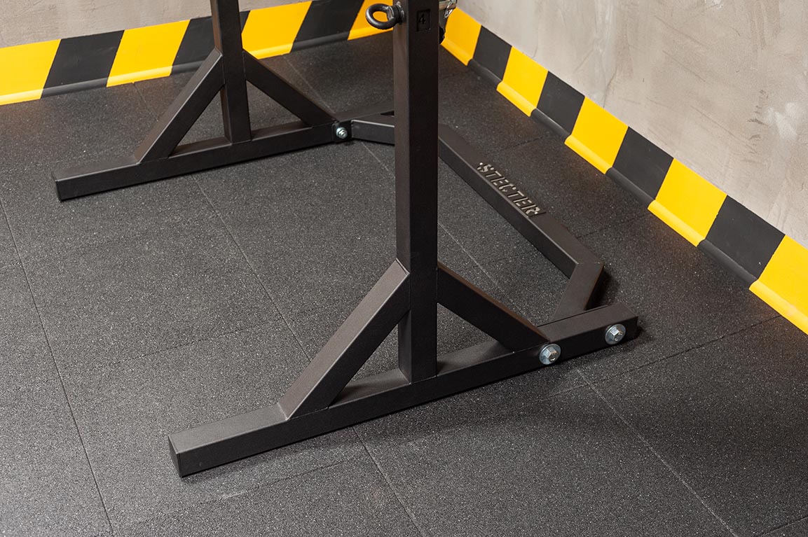 - Для максимальной устойчивости регулировочные стойки соединяются между собой балкой в форме трапеции, которая позволяет комфортно закатывать между ними скамью.
