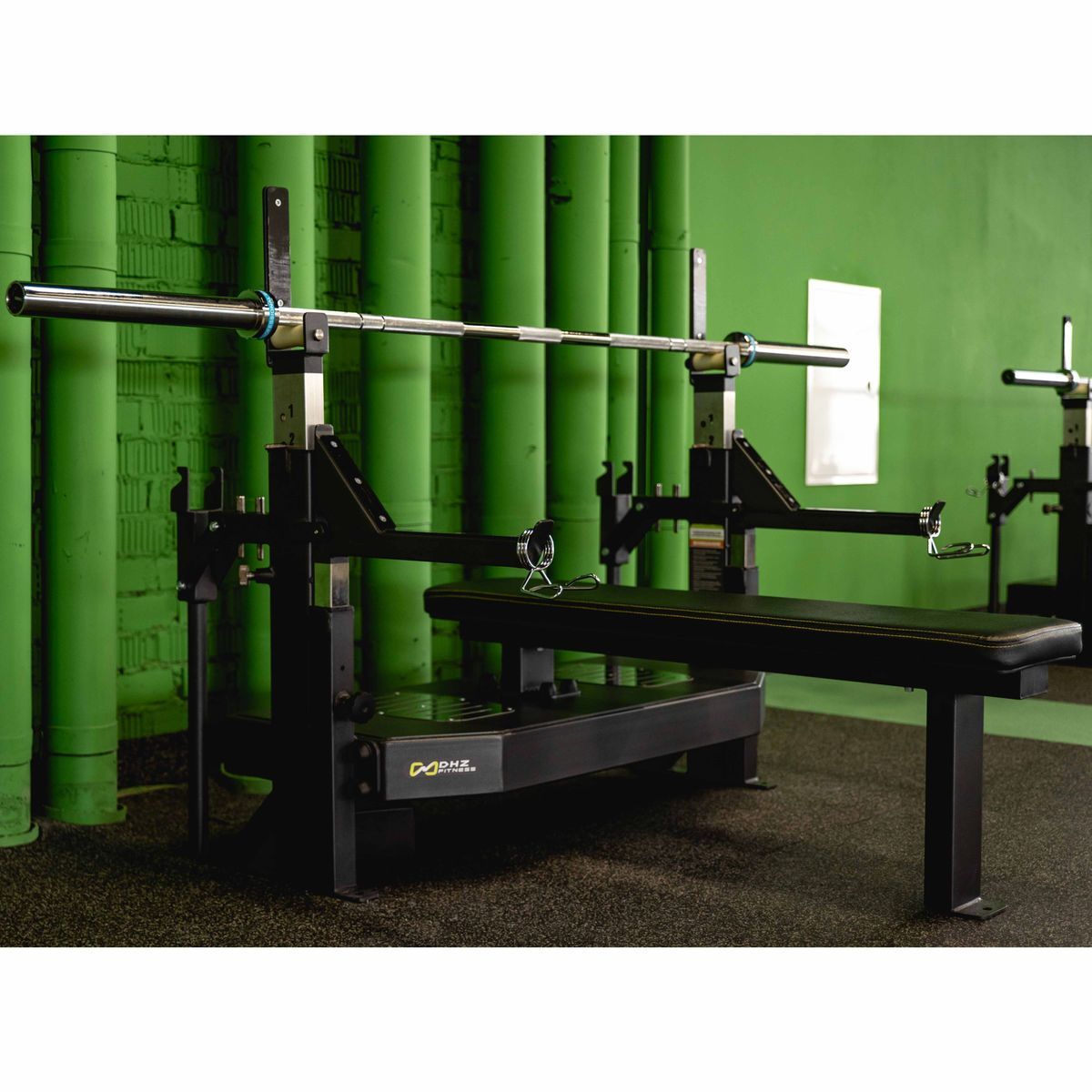 Классический вариант тренажера для выполнения упражнения «жим со штангой лежа». Стойка оснащена страховочными упорами с регулировкой по высоте для безопасности спортсменов во время выполнения упражнений. Рычажный механизм позволяет изменять высоту штанги, лежащей на стойке, не снимая ее.