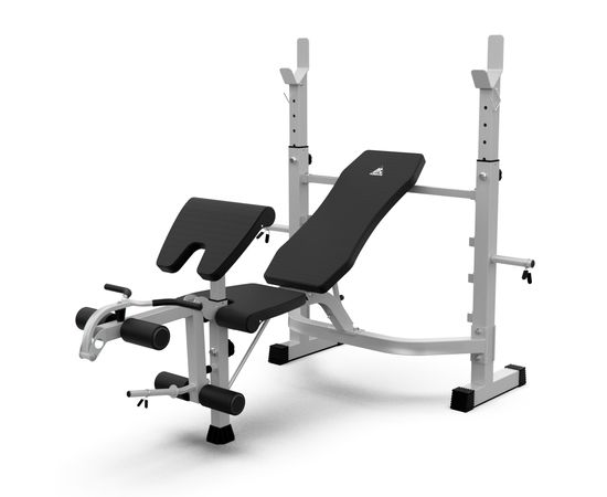 Универсальная скамья со стойками под штангу DFC D745 - следующая ступень в серии D740. Её стойки регулируются по высоте, в комплект поставки входят парта для бицепса и ручка для тяги. В качестве утяжелителя используются диски диаметром 26 мм (приобретаются отдельно).