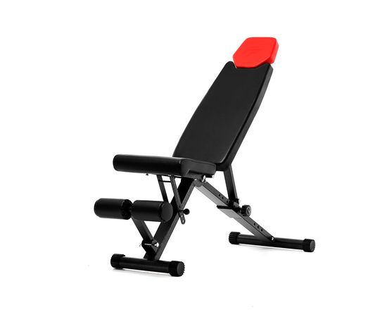 Функциональная и стильная скамья предназначена для домашнего использования. Имеет необычный дизайн: подголовник имеет ярко-красный цвет. Остальная конструкция выполнена в чёрном цвете. Такой дизайн подойдёт как для небольшого домашнего фитнес-зала, так и впишется в интерьер любой комнаты в доме или квартире.