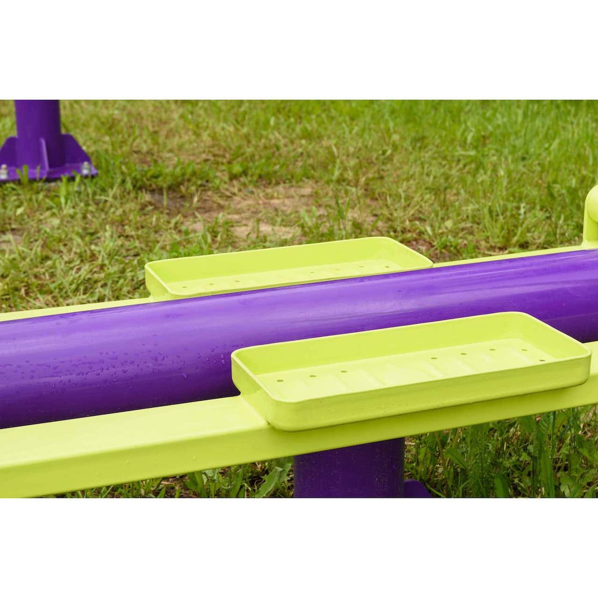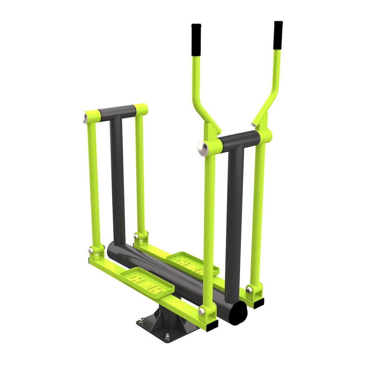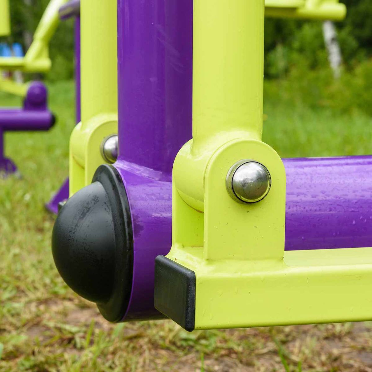 - Рычаги выполнены из труб ø57 мм. с толщиной стенки 3.0 мм. с узлами вращения на подшипниках качения, защищённых от воды манжетами. С одной стороны, рычаг имеет простой узел вращения, с другой стороны узел с ограниченным вращением, специально разработанный для применения на уличных тренажерах. Узел имеет цельнолитой корпус, с специальными перемычками для установки отбойников. В корпусе располагаются 3 пары отбойников двухстороннего действия, и четыре оси. На одном из рычагов располагаются ручки, изготовленные из гнутой, радиусом изгиба 90 мм, трубы ø33 мм. и толщиной стенки 3,2 мм.