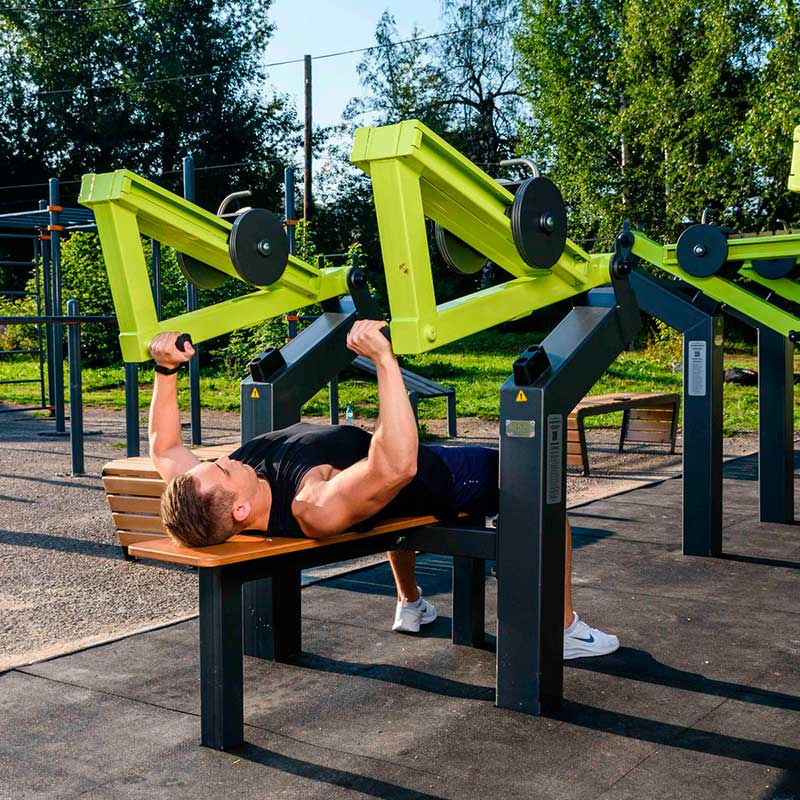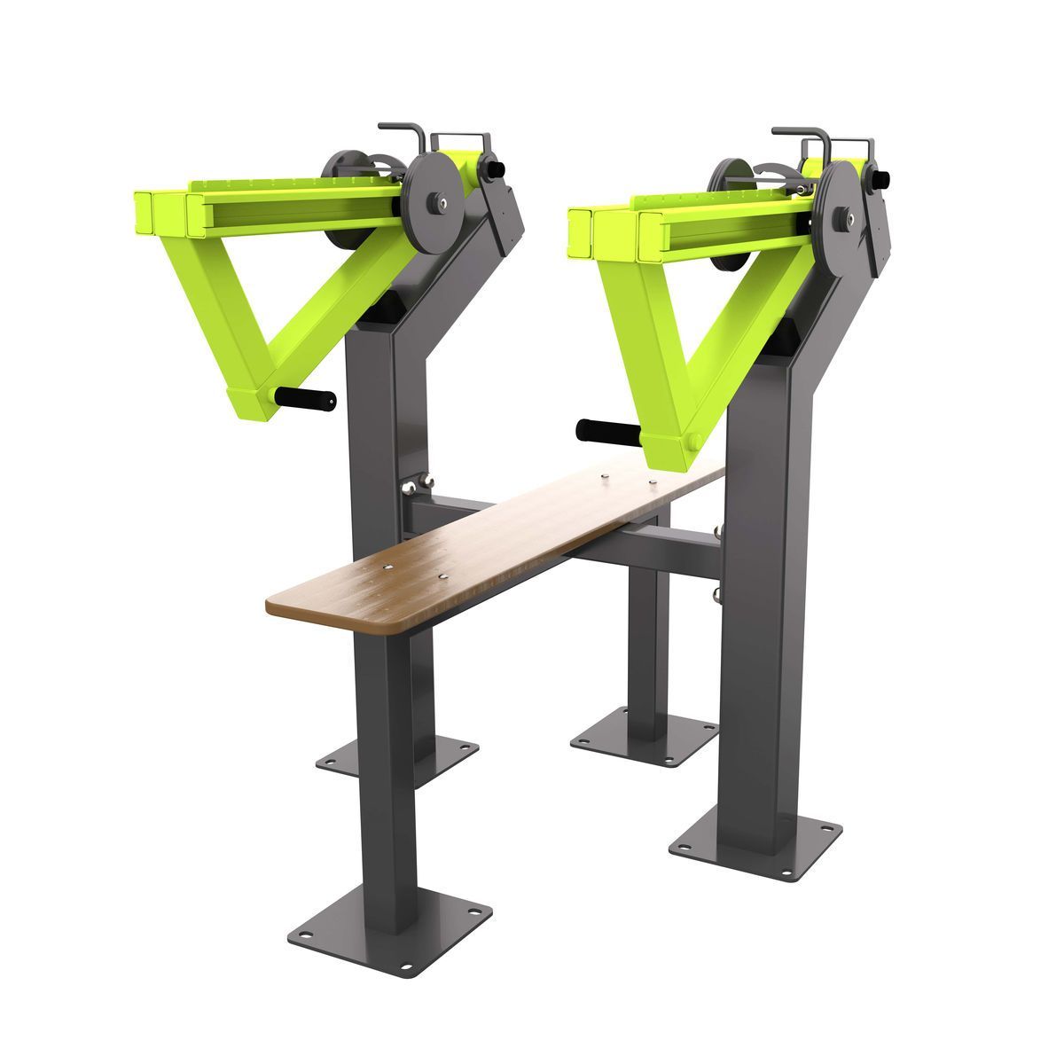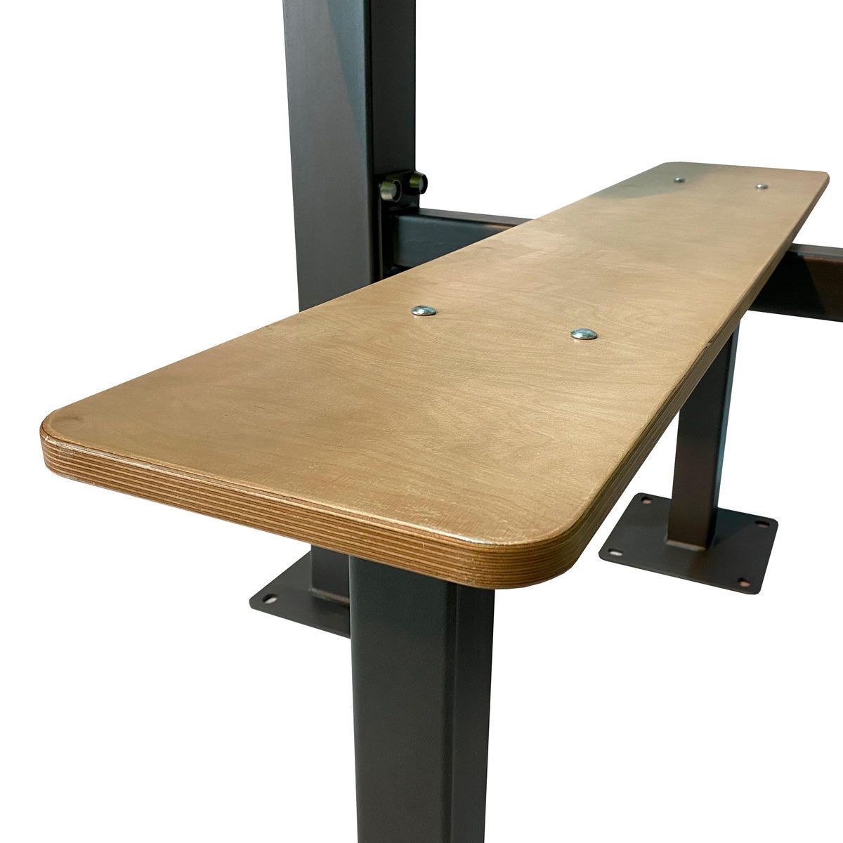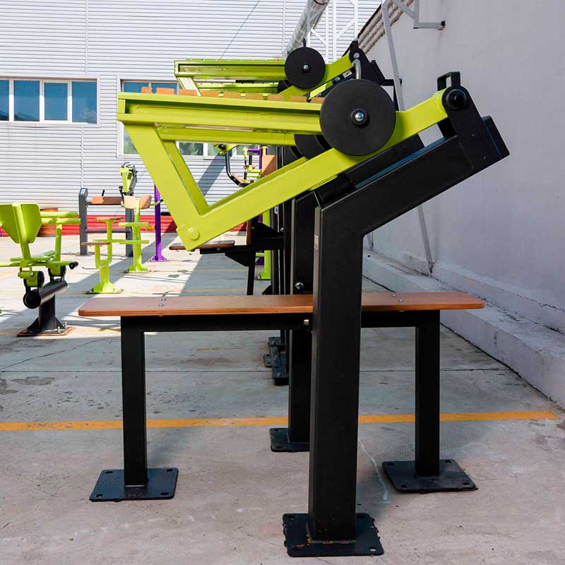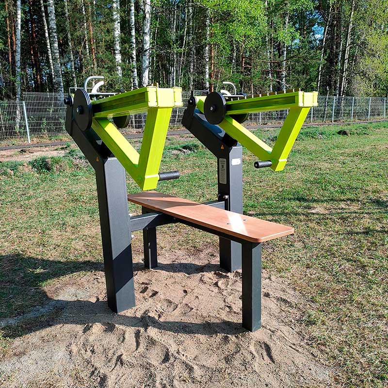 - Изготовление деталей осуществляется с применением технологии шип-паз на высокоточных станках лазерной резки, что обеспечивает точность линейных размеров, точность позиционирования деталей в сборочных узлах и стабильность размеров конструкции тренажера. Окраска металлических частей изделия выполнена методом порошковой окраски, обеспечивающей высокие антикоррозийные свойства, прочность, износостойкость и экологичность покрытия. Деревянные элементы покрываются защитным текстурным покрытием для древесины. Состав образует на поверхности древесины воздухопроницаемое, влагоотталкивающее полимерное покрытие. Сохраняет текстуру древесины и придает ей нужный оттенок. Надёжность и прочность соединений разъемных элементов тренажера, обеспечивается применением оцинкованного качественного крепежа.