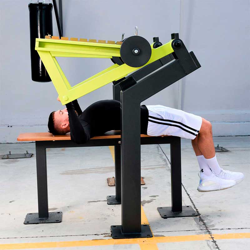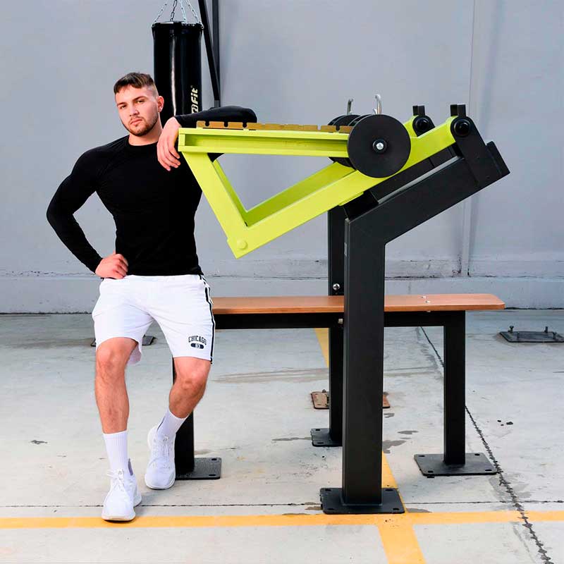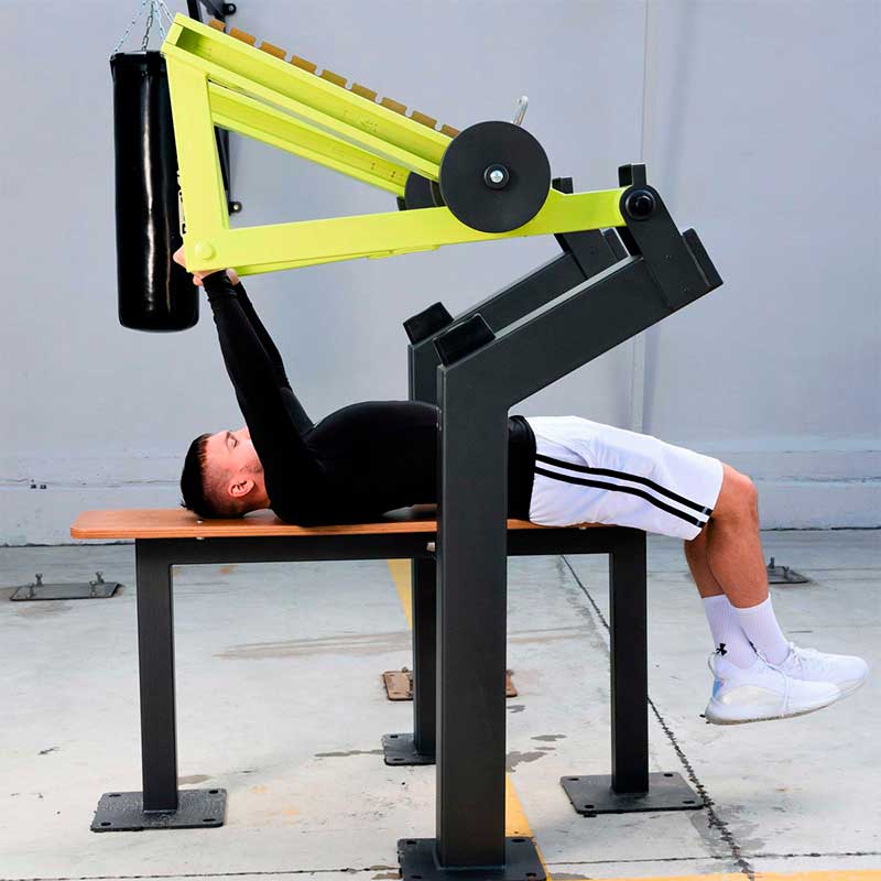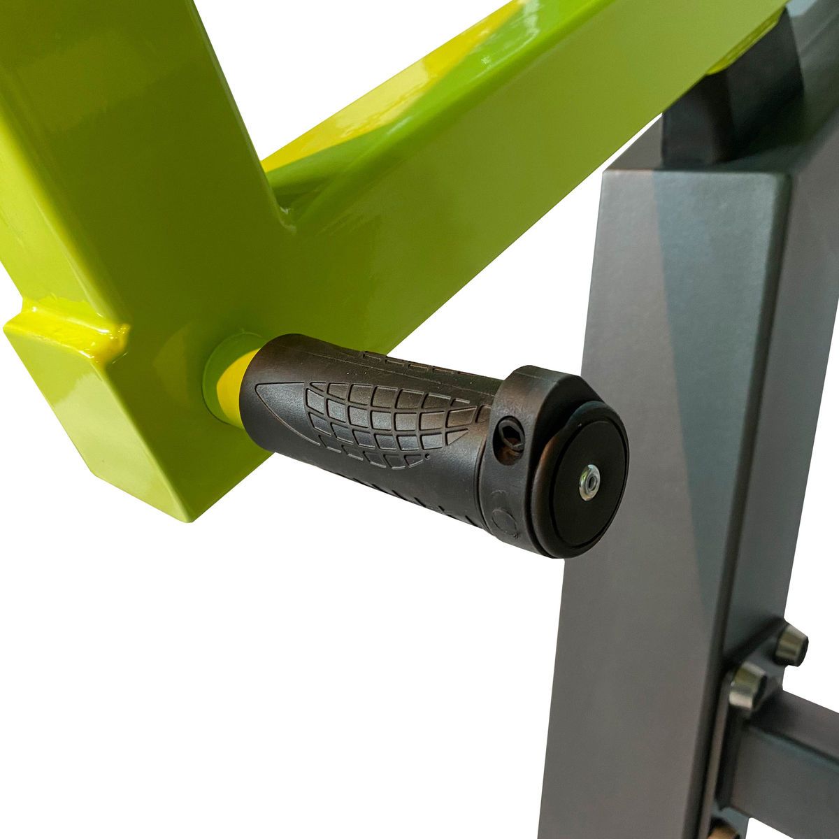 - Подвижные рычаги тренажера оснащены передвижными блоками, изготовленные из листового материала толщиной 8мм., на роликах д75, весом 20 кг на один подвижный рычаг. Плавное ступенчатое увеличение веса обеспечивается 10 положениями регулировки нагрузки.