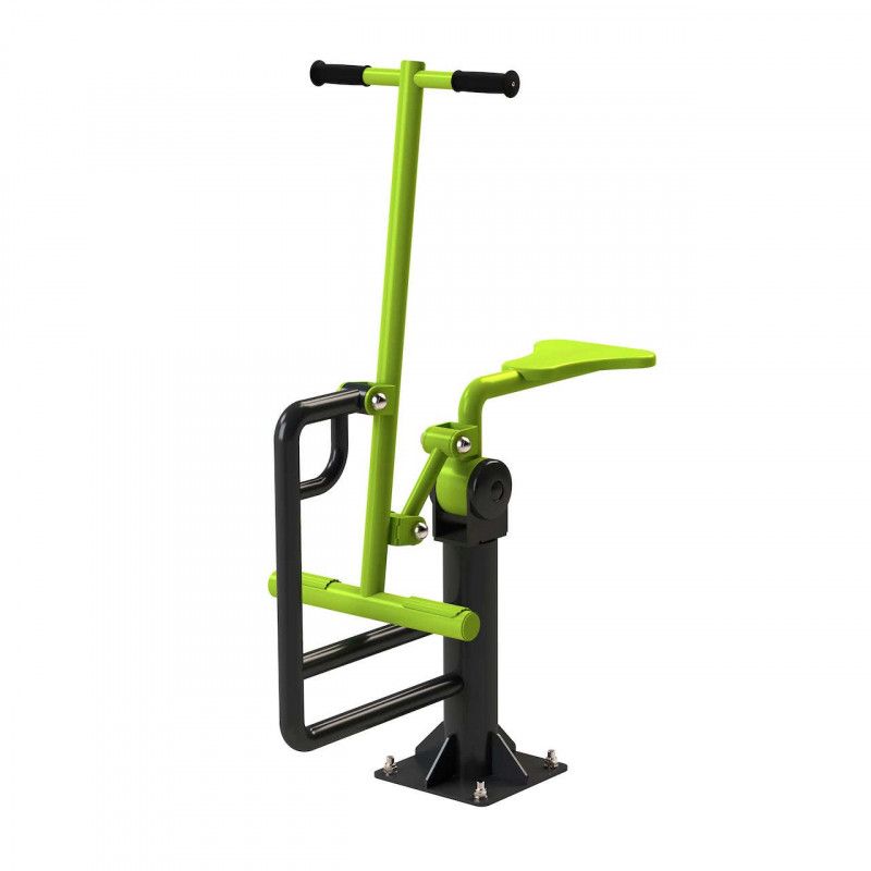 Тренажёр предназначен для выполнения массажных упражнений мышц ног. Конструктивно тренажёр состоит из рамы-столба с креплением узла с ограниченным вращением, рычаг-сиденья, рычага, связывающего рычаг-ручку и рычаг-сиденье, и рычага-ручки подвешенного на раму через узел вращения. За счёт применения специально разработанных узлов с ограничением вращения, в конструкции отсутствуют открытые отбойные элементы, что ведёт к уменьшению травмоопасности и исключает любое соударение частей тренажёра. Все детали тренажёра окрашены порошковой краской на полиэфирной основе. Торцы труб закрыты пластиковыми заглушками. Рукоятки, выполненные из полиэтилена низкого давления. Монтаж тренажера производится на закладную, забетонированную заранее.