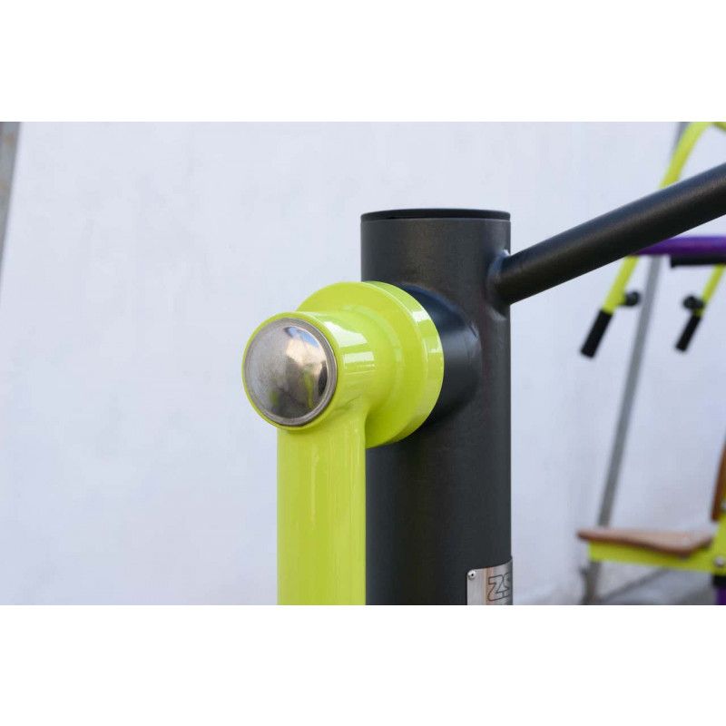- Рычаги выполнены из труб ø57 мм. с толщиной стенки 3.0 мм. с узлами вращения на подшипниках качения, защищённых от воды манжетами. С одной стороны, рычаг имеет узел с ограниченным вращением, специально разработанный для применения на уличных тренажерах, с другой стороны опора с ногоступом. Узел имеет цельнолитой корпус, с специальным упором для работы отбойников. В корпусе располагается: пара отбойников двухстороннего действия, манжеты и подшипники качения.