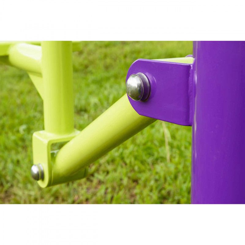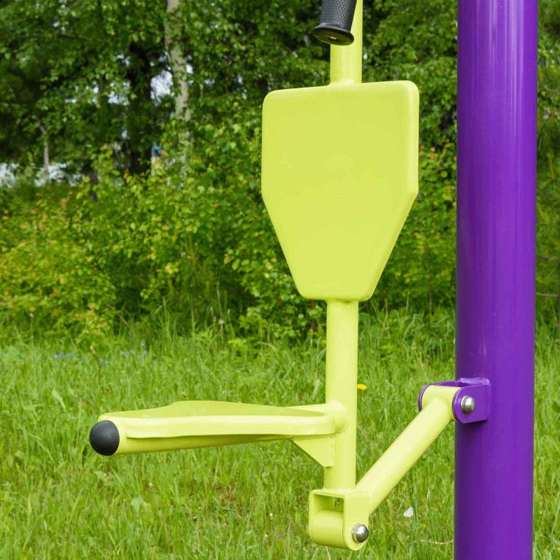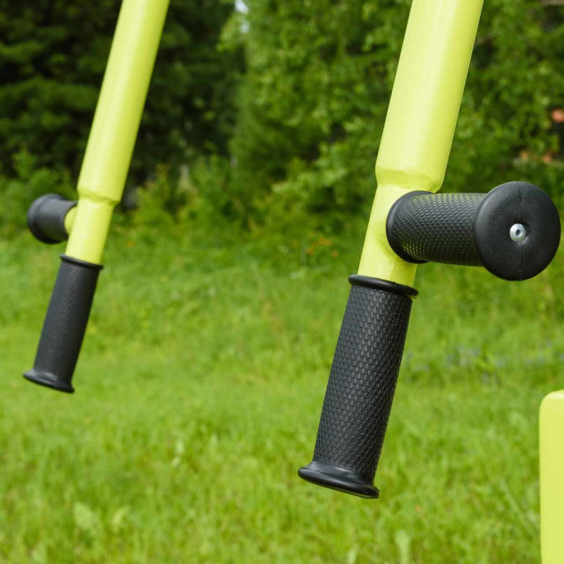 - Рычаги выполнены из труб 50х50 мм. с толщиной стенки 3.0 мм. с узлами вращения на подшипниках качения, защищённых от воды манжетами. С одной стороны, рычаг имеет простой узел вращения, с другой стороны узел с ограниченным вращением, специально разработанный для применения на уличных тренажерах. Узел имеет цельнолитой корпус, с специальными перемычками для установки отбойников. В корпусе располагаются 3 пары отбойников двухстороннего действия, и четыре оси. На одном из рычагов располагаются ручки, изготовленные из гнутой, радиусом изгиба 90 мм, трубы ø33 мм. и толщиной стенки 3,2 мм.