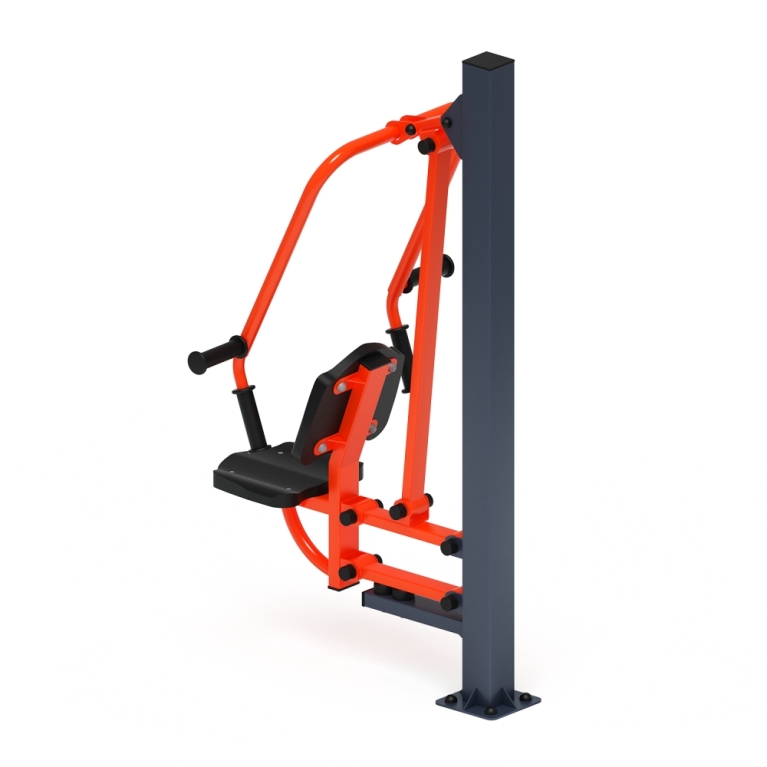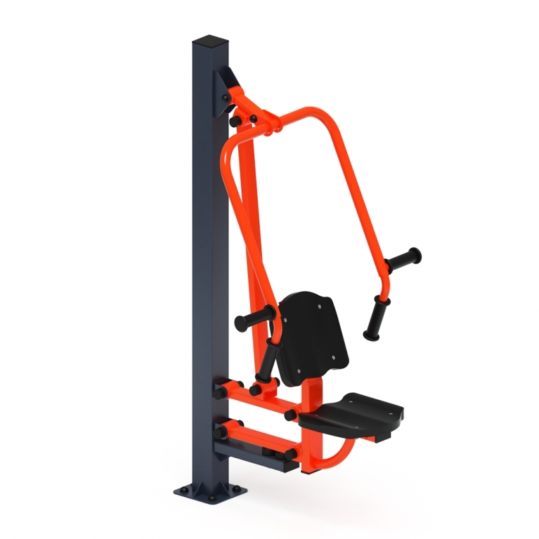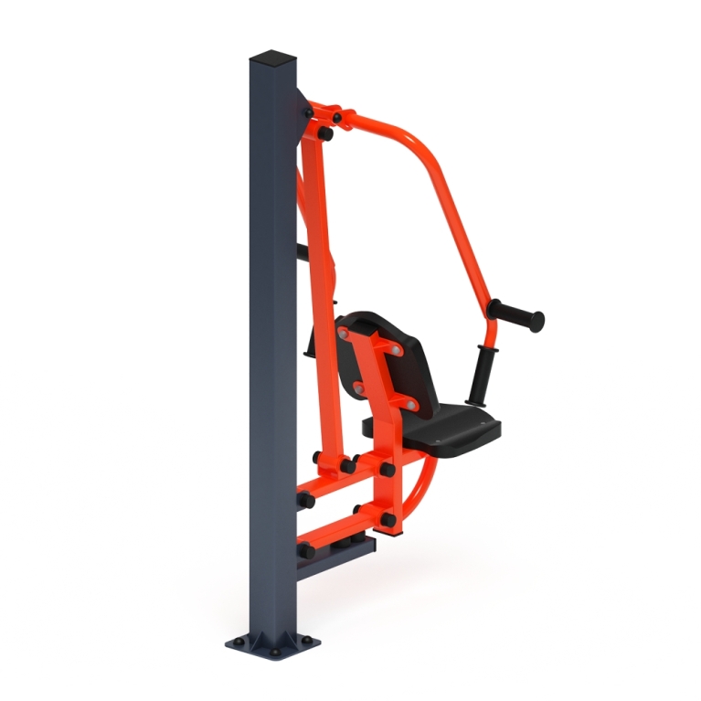 Уличный тренажер предназначен для установки в местах общественного пребывания детей и взрослых (уличные дворы, парки, школьные учреждения и т.д.). Он задействует широчайшие мышцы спины, грудные мышцы, большую круглую мышцу, задние части дельтовидных мышц, бицепсы, плечелучевые и трапецевидные мышцы. В результате работы на тренажере увеличивается мышечная масса груди, спины и рук, что формирует красивый силуэт спортивной фигуры. Полностью соответствует ГОСТам по безопасности и имеет соответствующие сертификаты. В состав уличного тренажера Жим от груди входит несколько элементов:
