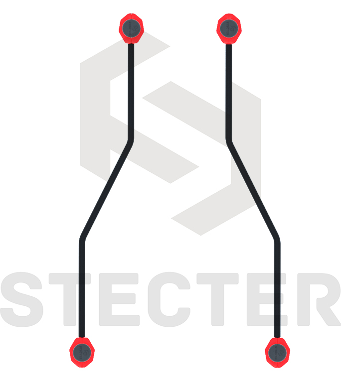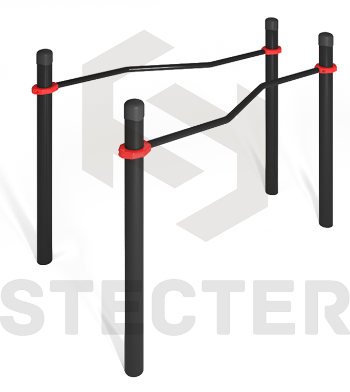 Комплекс состоит из четырех опорных столбов высотой 1200 мм и двух зигзагообразно изогнутых жердей длиной 1790 мм. Расстояние между центрами опорных столбов брусьев: 608 мм - с одной стороны и 1008 мм - с другой стороны. Жерди крепятся к опорным столбам при помощи хомутов на высоте 1000 мм от поверхности основания. Длина комплекса не более 2010 мм.