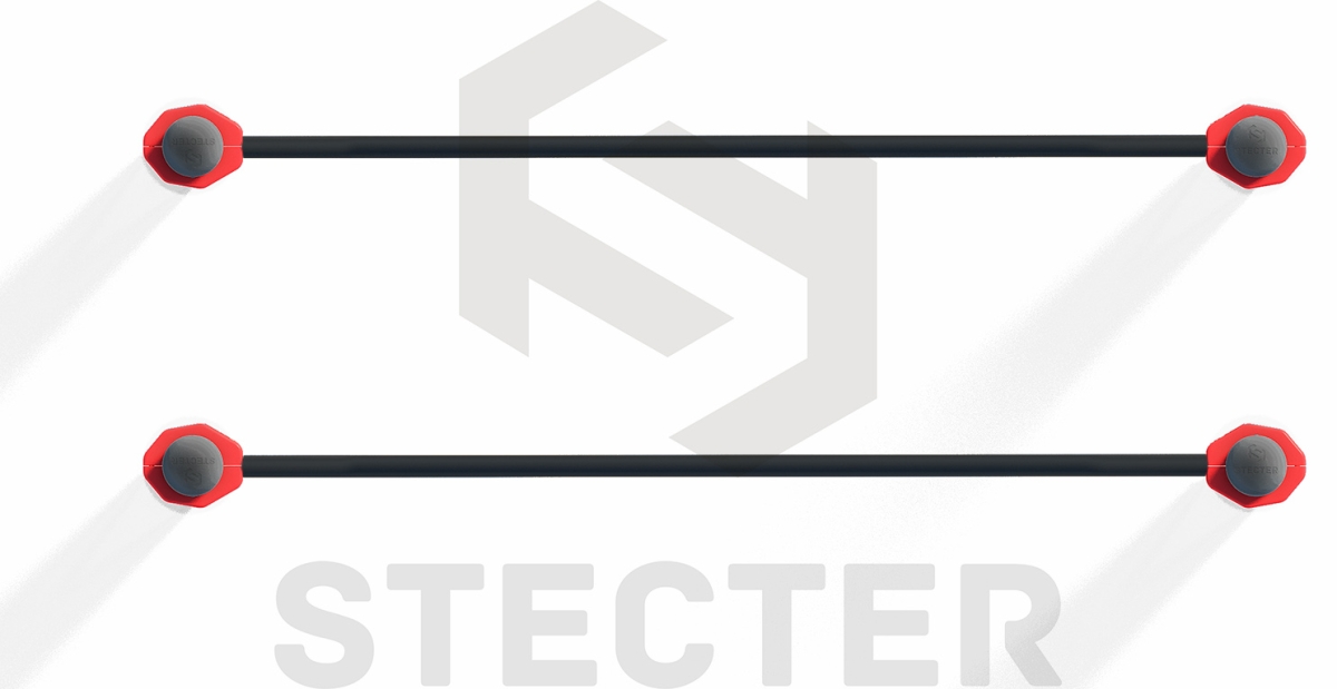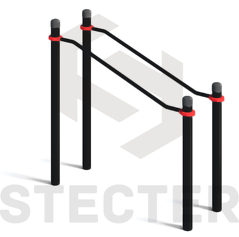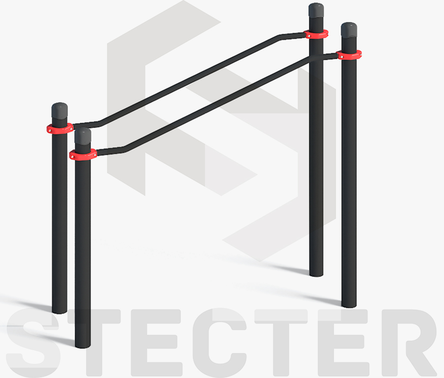 Комплекс состоит из четырех опорных столбов высотой: 2 шт. - 2000 мм, 2 шт. - 1200 мм и двух жердей длиной 1790 мм, концы которых изогнуты к опорным столбам в противоположные стороны под углом 30 градусов. Расстояние между центрами опорных столбов брусьев 608 мм. Жерди крепятся к опорным столбам при помощи хомутов на высоте: 1466 мм - в верхней части и 1000 мм - в нижней части от поверхности основания. Длина комплекса не более 2010 мм.