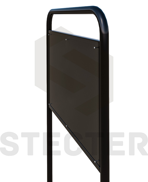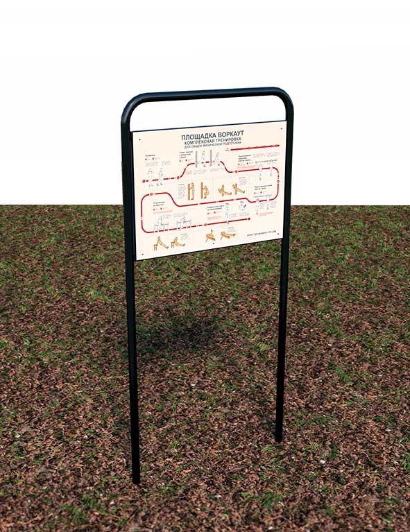 Информационный стенд можно использовать для самых различных целей. К примеру, на нем можно устанавливать таблички для ознакомления с государственными нормативами физической подготовки, либо размещать информацию о результатах в процессе уличных соревнований по воркауту. Учитывая тот факт, что стенд предназначен для установки под открытым небом, он выполняется из цельного металла и крепится к стальным трубам.