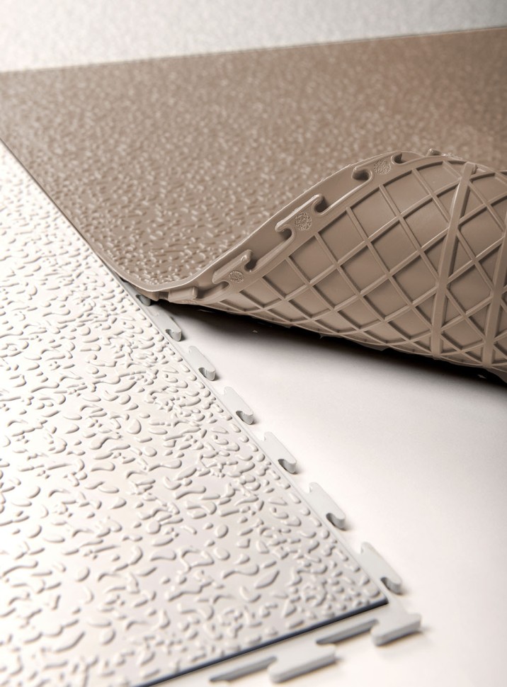 На каждой стороне плитки находятся 16 замковых креплений, которые прочно смыкаются между собой. Таким образом, плитки имеют двойную систему креплений, что делает напольное покрытие более прочным и водонепроницаемым..