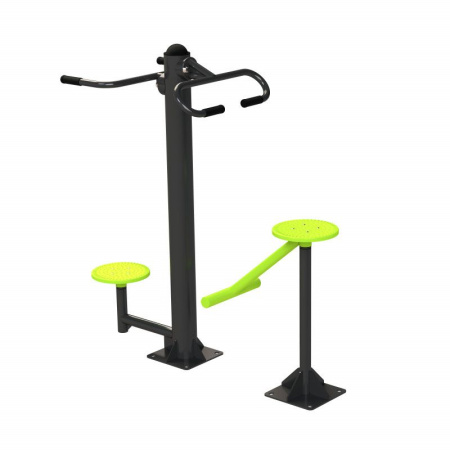 Тренажёр предназначен для тренировки мышц ног, поясницы и спины. Конструктивно тренажёр состоит из сборной рамы, ручек, сиденья и диска, установленного на отдельно стоящую закладную. За счёт применения специально разработанных узлов вращения с отягощением, тренажер имеет повышенный уровень нагрузки. Все детали тренажёра окрашены порошковой краской на полиэфирной основе. Торцы труб закрыты пластиковыми заглушками. Рукоятки, выполненные из полиэтилена низкого давления, закреплены заклепками.