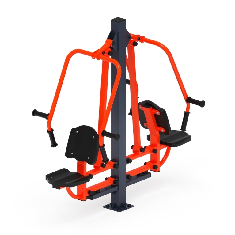 Уличный тренажер предназначен для установки в местах общественного пребывания детей и взрослых (уличные дворы, парки, школьные учреждения и т.д.). Он задействует широчайшие мышцы спины, грудные мышцы, большую круглую мышцу, задние части дельтовидных мышц, бицепсы, плечелучевые и трапецевидные мышцы. В результате работы на тренажере увеличивается мышечная масса груди, спины и рук, что формирует красивый силуэт спортивной фигуры. Полностью соответствует ГОСТам по безопасности и имеет соответствующие сертификаты. В состав уличного тренажера Жим от груди двойной входит несколько элементов: